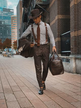 - The Alessandria Brown Wool Fido Fedora, a timeless accessory that adds a touch of nostalgia to the outfit, paired with the Chocolate Knitted Tie to showcase classic texture and charm. For added retro flair, we’ve added the wide Dark Brown Convertible Braces, providing both style and functionality. We’ve completed the ensemble with the Brown California Duffel Bag, a practical yet fashionable accessory that completes the look with a touch of old-school elegance.