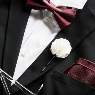 The Bob Silk Boho Pre-tied Bow Tie paired with the Burgundy Stitched Pocket Square adds a subtle yet stylish detail that enhances the look. We’ve completed the look using classic appeal with the Luxurious White Lapel Flower, adding a touch of flair and sophistication.