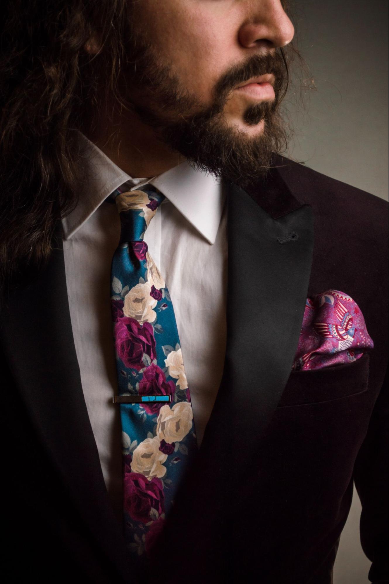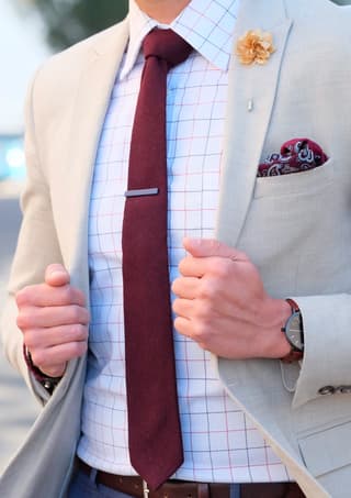 - A Raw Handmade Dark Bordeaux Tie adds a touch of sophistication with its rich colour and handcrafted design paired with the Peony Golden Beige Lapel Flower, which brings a subtle float accent to your lapel. The Red & Lavender Baroque Silk Pocket Square complements the tie and lapel pin with its intricate pattern and luxurious silk fabric. The look is completed with the Short Matte Dark Blue Tie Clip and the Hjalmar Torika Watch II, which blends classic design with modern elements.