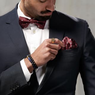 - The Bordeau Pre-tied Bow Tie paired with the Burgundy & White Christmas Pocket Square, both festive and vibrant in their colours, capturing the spirit of celebration. We have complemented them with the Gold-tone Ryker Ring, and the Blue Agate & Lava Miro Bracelet for a touch of sparkle and style on the wrist.